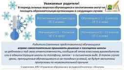 В период сильных морозов родители (законные представители) обучающихся вправе самостоятельно принимать решение о посещении школы их ребенком и под свою ответственность (далее подробнее)